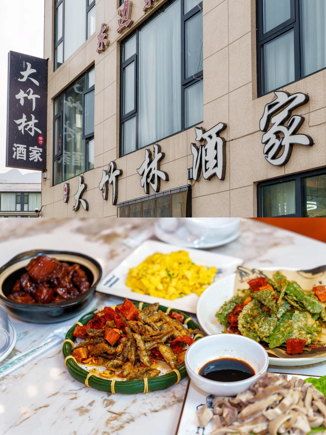從雲上草原玩了一整天,飢腸轆轆的我們在竹海邊發現了這家「大竹林酒家」。停車場寬敞方便,對於自駕遊客來說真是貼心設計。